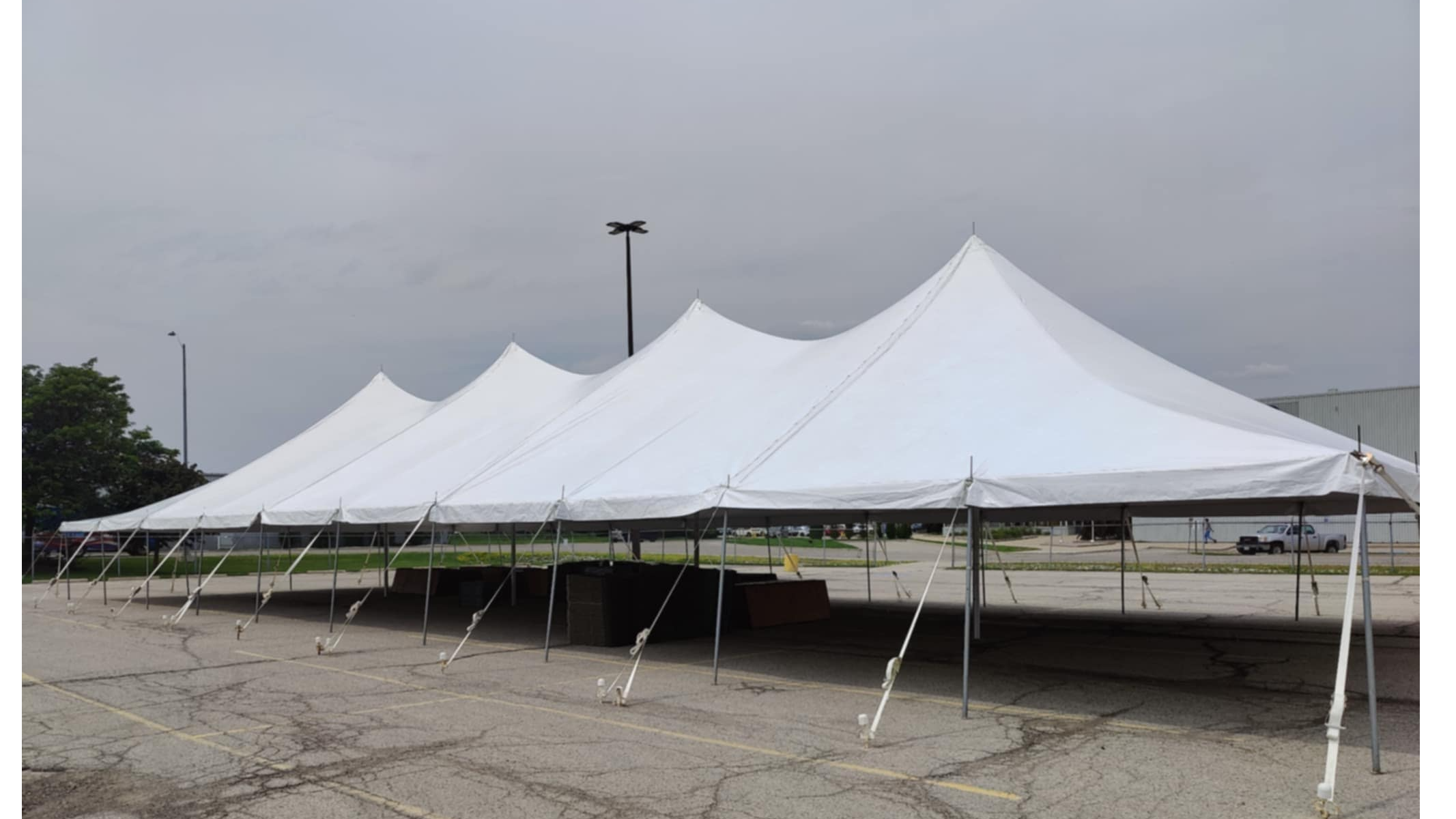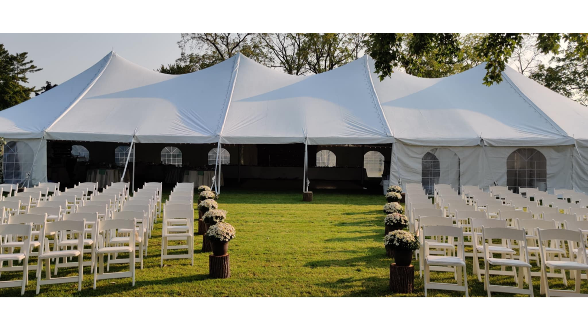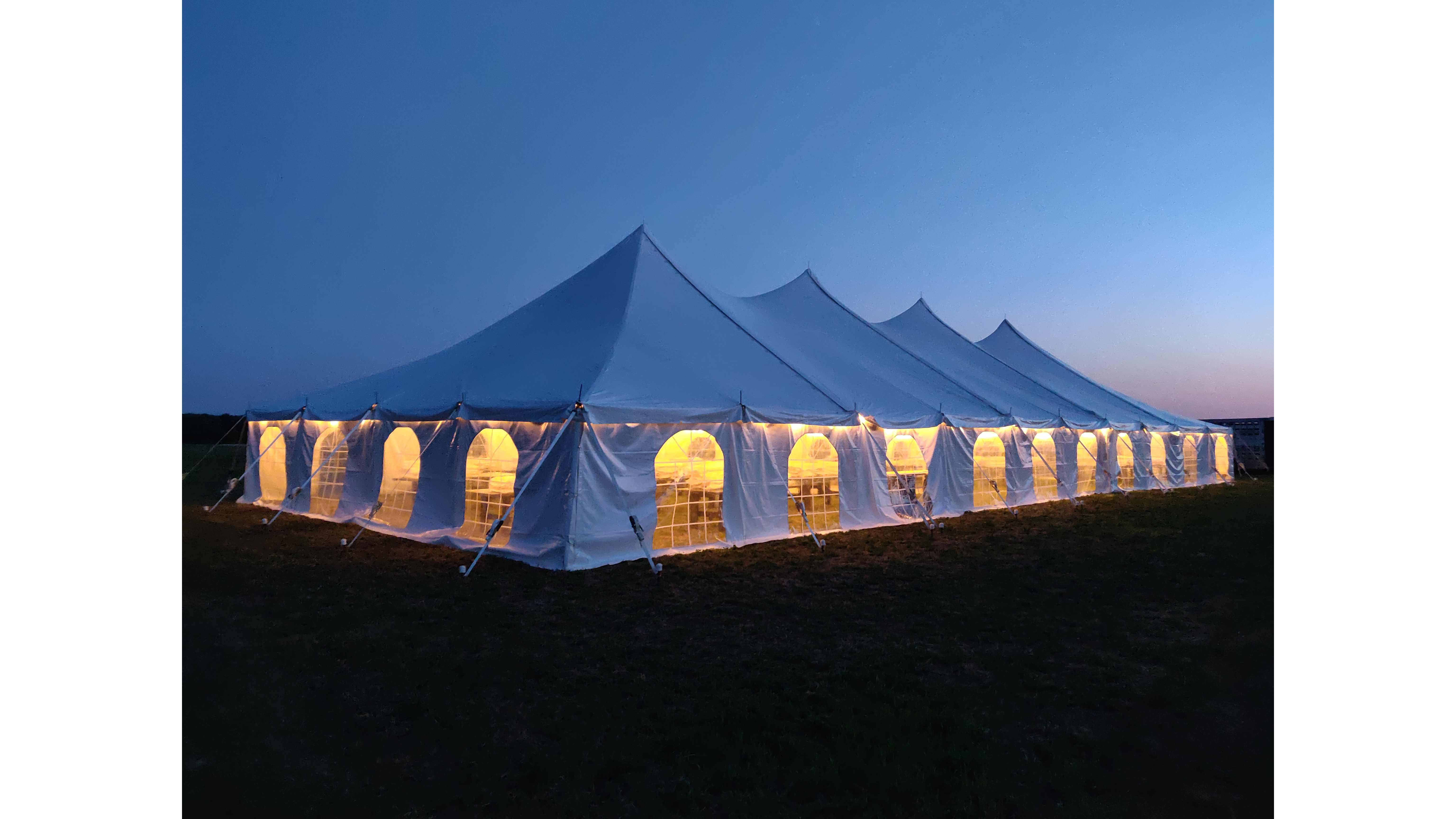 This 4-peaked 40x100' Premiere Pole Tent can transform a grassed property into a stunning wedding venue with installation from our skilled crew. This tent is recommended for 200+ guests seated at tables.