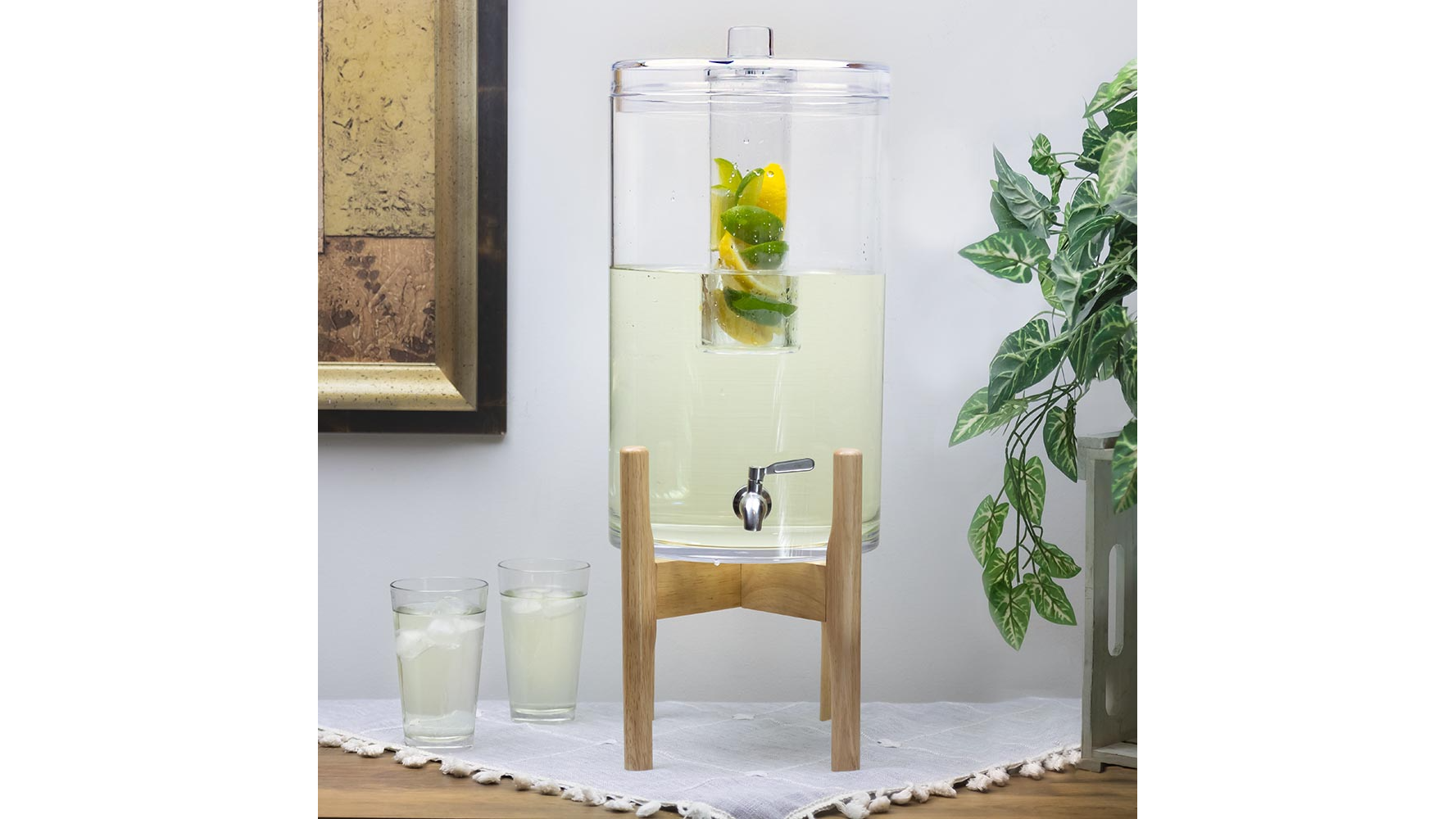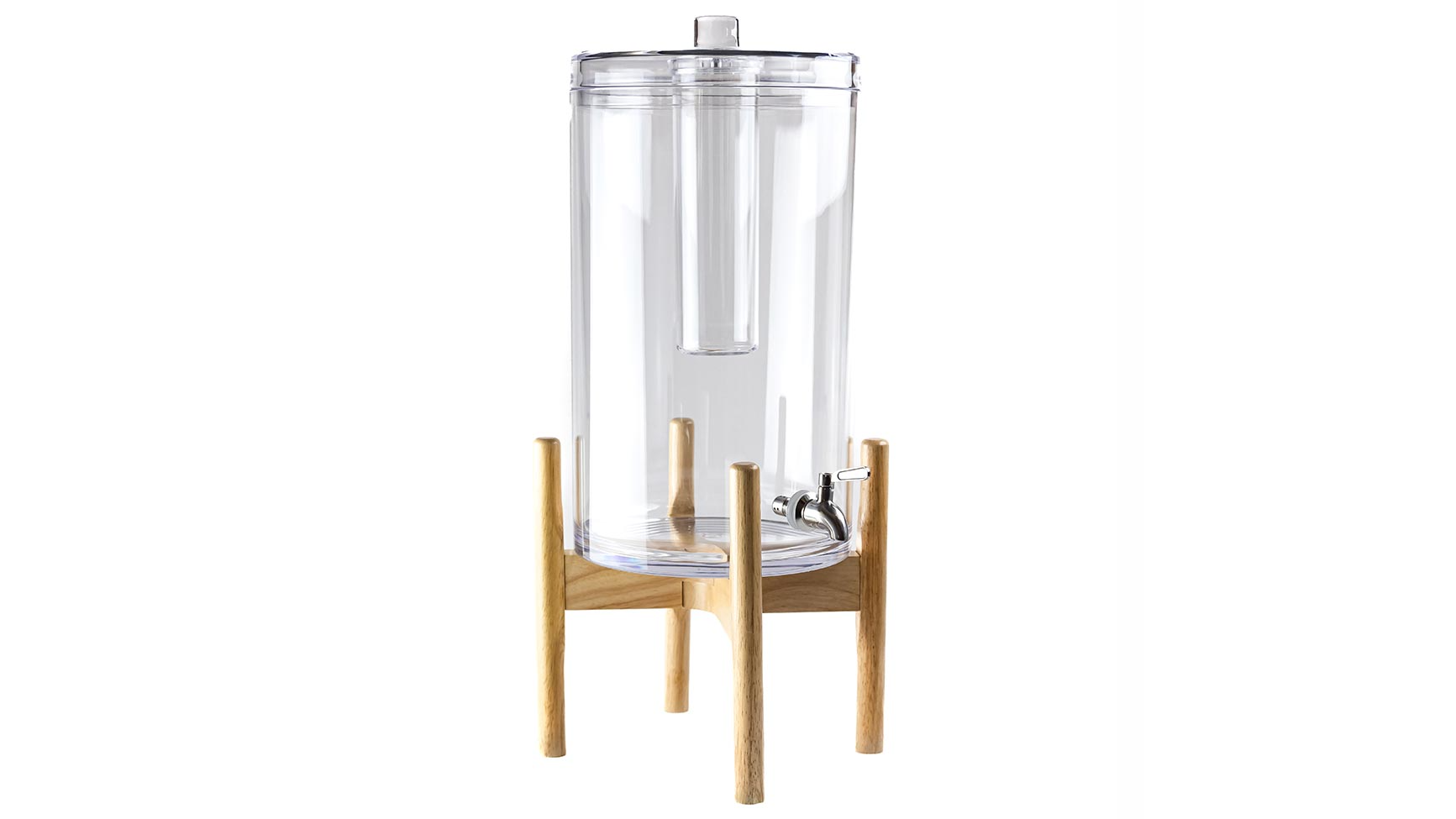 This stunning beverage dispenser can house up to 4.2 gallons of liquid making it the perfect addition to hydrate your guests. The ice chamber can be filled with ice, fruit, flowers etc. Wood stand included.